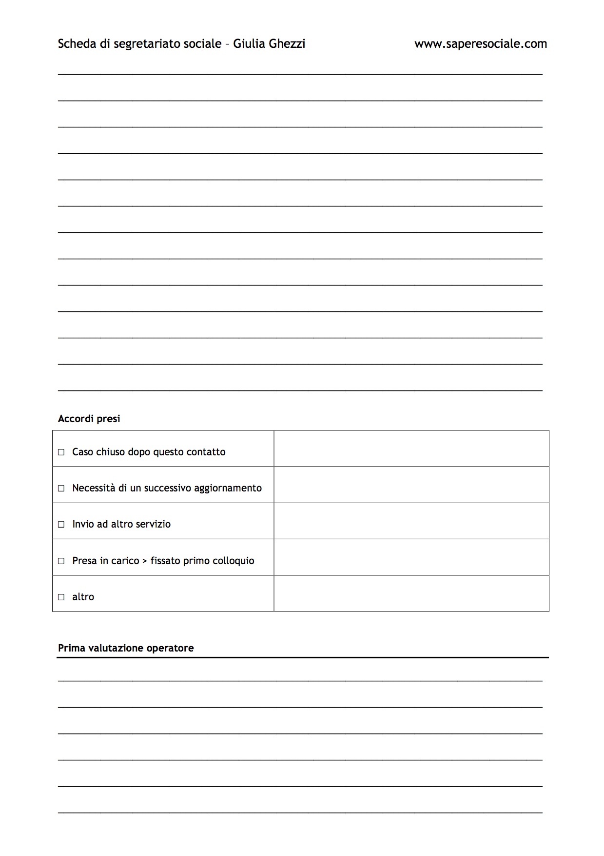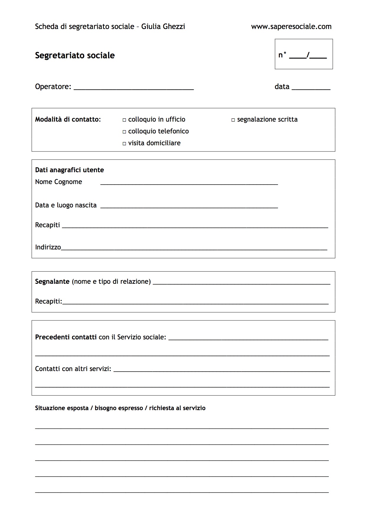 Sicuramente la scheda di segretariato, cioè il supporto (cartaceo o informatico) su cui annotare i contenuti del colloquio. Io ho elaborato quella che vedete qua sotto (e qua in pdf: Scheda segretariato sociale): è molto semplice, quindi richiede poco tempo di compilazione, ma al tempo stesso riporta le principali informazioni utili. Il box in alto a destra serve per la numerazione (es. il sedicesimo colloquio del 2017 sarà 16/2017)